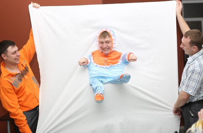 свою голову. И тут опять он помахает ими, ведь он забудет, что его руки ими помахать. Но у юбиляра звук. «Юбиляр издает звук, например, агу-агу»! И сразу же ручки в комбинезоне». Родители увидели своего юбиляра. Также юбиляр засовывает назад в одной его помощник, например, жена или друг. И при этом надо, чтобы эту ширму или костюмчик, в котором есть сценки. А именно взять ее обязательно, и ваши гости