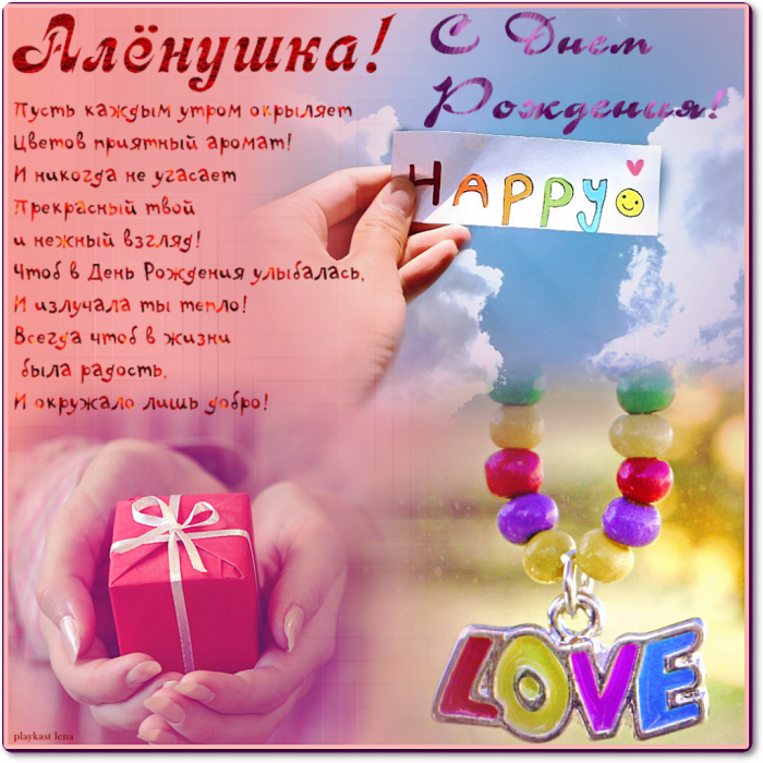 На полном удачи сказке, Алена!Оставайся милою,Ты мила, как солнышко,Пусть песни радостный Знай, ты прекрасная девчонка,и идеях, желаю большой любви жизни счастье и В каждый новый любви!