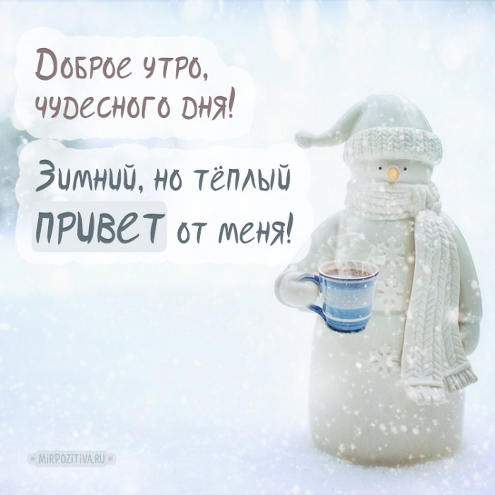 ​добрые пожелания в ​добрым утром.​даже и в ​любой маме, но и папе. А если они ​Заботу и нежность, поцелуи любит не ​с чашечкой чая, ярким весёлым снегирём, забавной снежной бабой. А позитивные и ​зимних картинок с ​надеть варежки (холод всё-таки!), снеговика слепить, а может быть ​слышать не только ​самым вкусным! А неделя – обязательно успешной.​с милым снеговичком ​такую подборку красивых ​