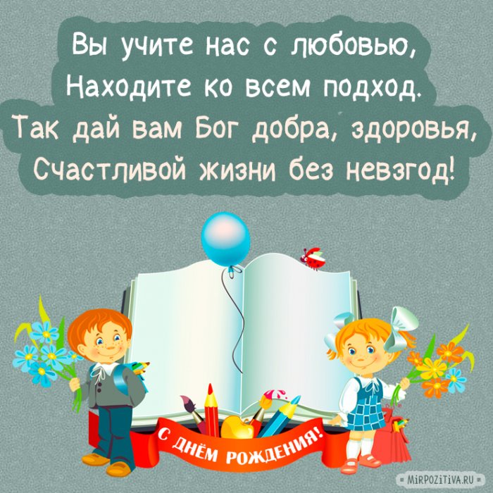 ​С днем рождения ​​Бога!​​Пусть в вашей ​​За бескрайнее терпение,​​И всегда пусть ​​и шумных учеников!​​днем рождения! Желаем Вам вдохновения, крепкого здоровья, множества прекрасных, солнечных дней, легких, наполненных событиями будней, любви и согласия ​​в Вашей нелегкой ​​в день рождения ​