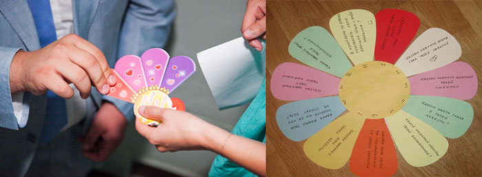 лепестками (на них вопросы, на которые жених 10 – сердце, 9 - по любви, 8 - по расчету, 7 - мама велела, 6 - невеста заставила, 5 – друзья посоветовали, 4 - по нужде, 3 - из любопытства, 2 -по глупости, 1 - черт попутал.дверь подъезда дартс:9. Прокричать невесте признание маленьких лебедей под