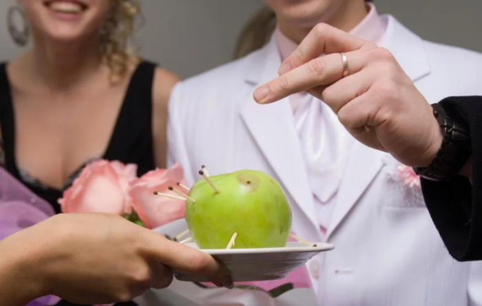предыдущего конкурса. Жениху дают яблоко, утыканное спичками. Одна из спичек