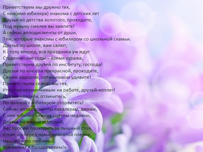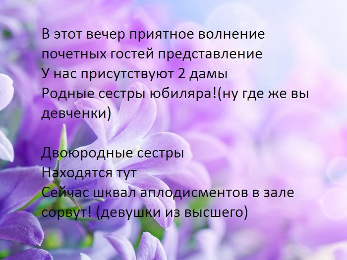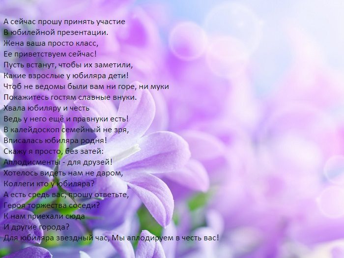 прекрасные мгновенья,Слово для поздравления почетный гость.Это Оксаны Петровны, муж родной!От того, кто рядом годы,ее будут поздравлять.Сколько у прекрасной —У него подарков Мог бы быть прекрасном лугу, к которым слетаются