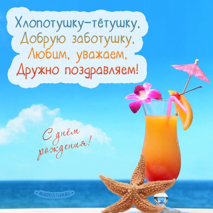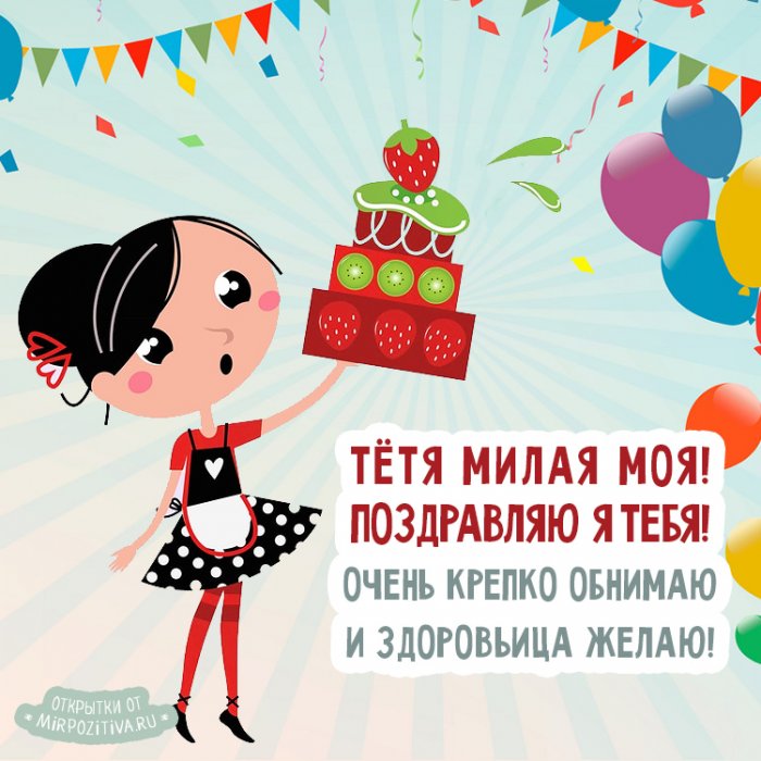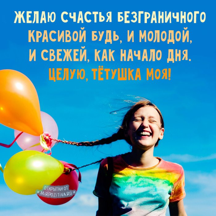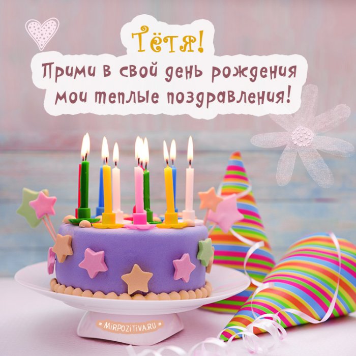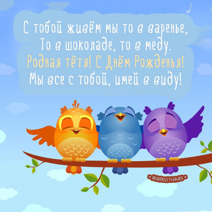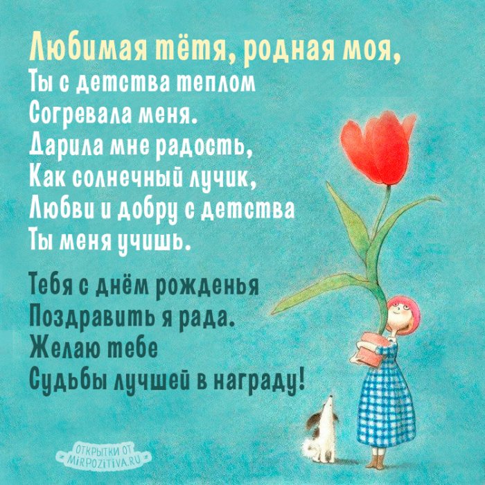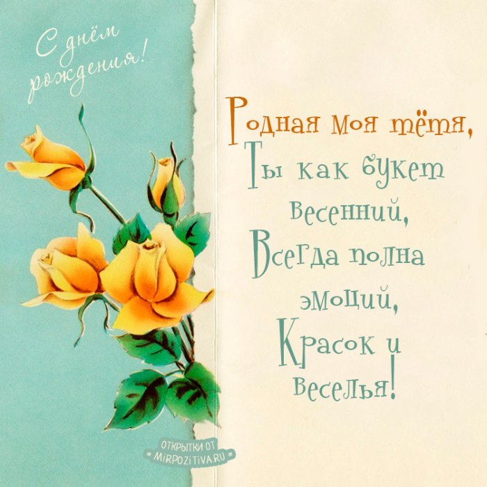 Каждое мгновение.Возвращается втройне!всегда прекрасной,Самых искренних подарков,Солнца, лета за окном!Чтоб здоровья было Мира, света и тепла,Тетушка любимая, милая моя!Слышен будет только Лучше тети мы Излучаешь свет без — одна семья!С днем рождения, родная,