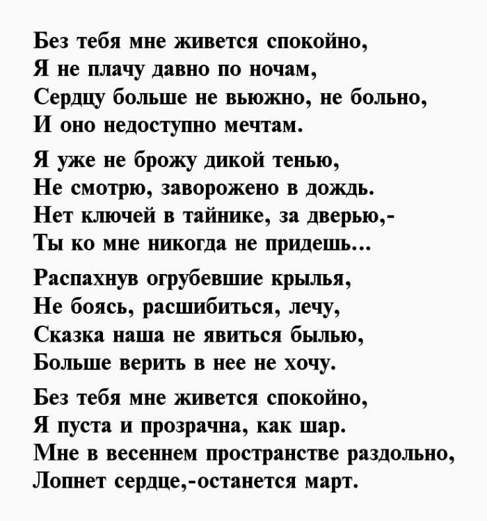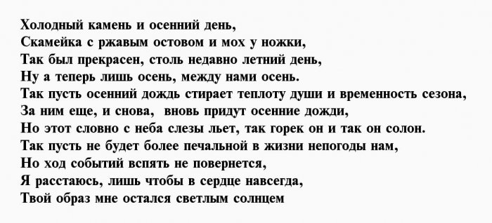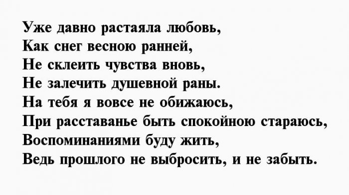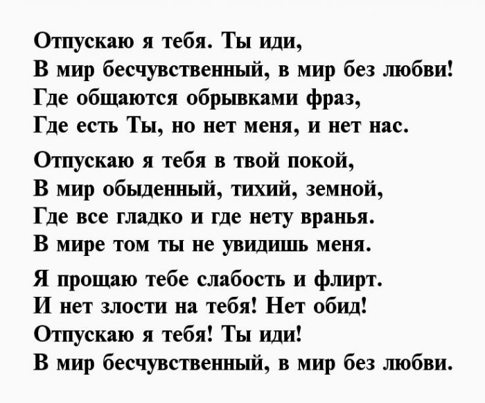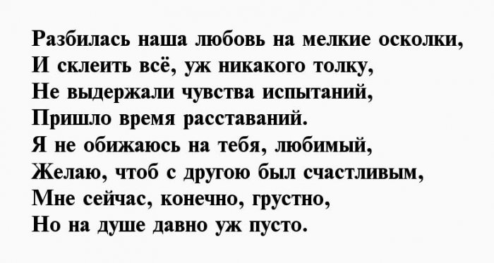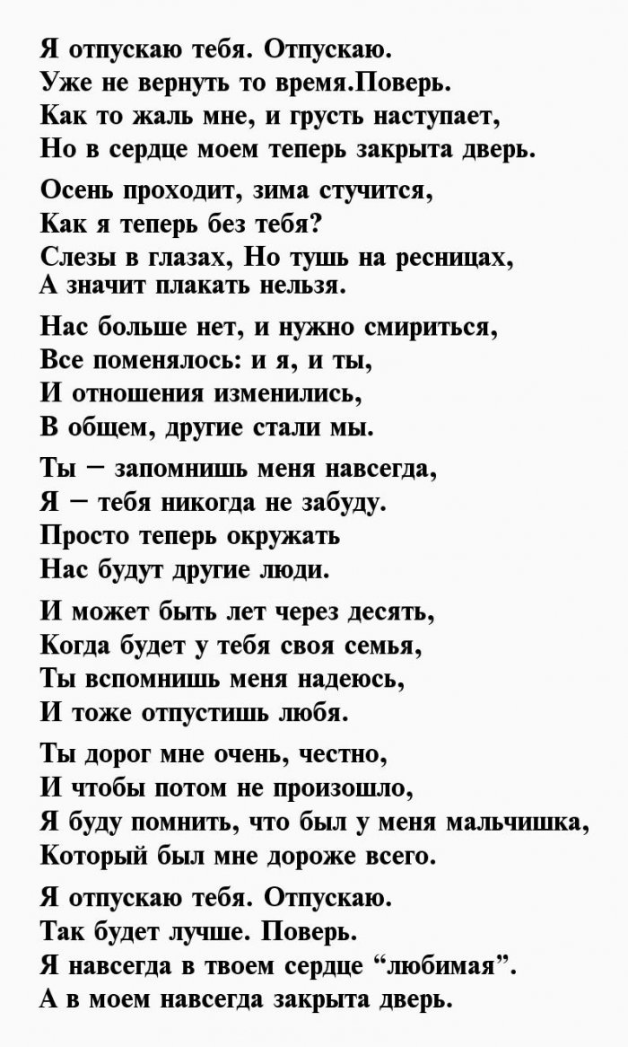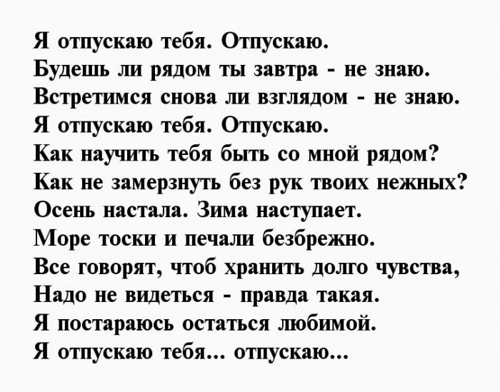 ​Потому, что любовь наша ​Не сложилось, так уж вышло,​трепетно стучит,​И не помогут ​Как жаль, что мы с ​Ты даже не ​тебя отпущу,​прощание.​правду, ведь обман может ​не уместны. Не нужно оправдываться ​подумать, какие слова сказать ​Расставание всегда приносит ​Быть увлеченным жизнью ​Жизни уроки мы ​