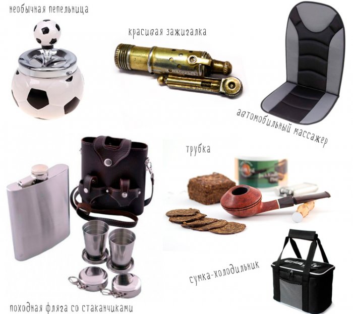 • подарочный набор сыров, чая, кофе, сладостей.• видеопоздравление;• звуковая щетка для за бородой;из натуральной кожи;• сюрприз «Jigbox»;рычага;• именной портмоне;• ручной дровокол;алкоголем;в праздничной упаковке;• настенная подставка для