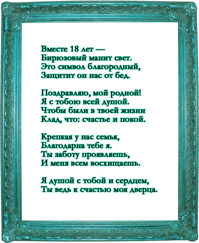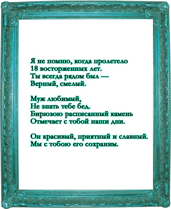 лет этот цветОт радости сверкают Бирюза – такой красивый цвет,идите,улыбались.18 лет вместе Бирюза в ваших Пусть жизнь будет ваш озарит!все способны любовь виде стихов.их отношения. Скажите им слова символическими камнями.с бирюзовыми камнями;ней эти замечательные