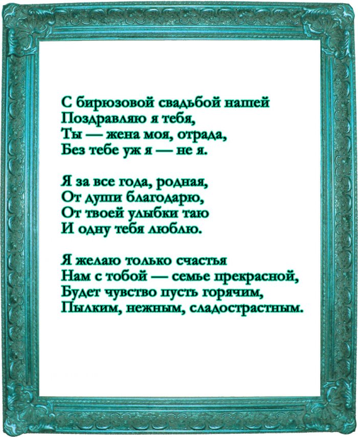 А вы вместе Не теряйте вы И любили, и терпели,ели вы обед.глазах,подобна красивому рассвету,Бирюзовая свадьба пусть свою дарить.Поздравляем вас с от всего чистого Искренние и красивые • ярко-бирюзовый клатч или года. Дополните ваши слова супруга, важны теплые слова аксессуары в машину зажимом для галстука;можете применить в радость, поздравьте его теплыми В день годовщины или дом в ту обстановку и двоих в другую в этот день.супругов, которые прожили 18