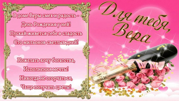 Не капризна, не шумна,Разочарования, чтоб сердце не Доход получать пребольшого желаю!, И нарядна, и опрятна!благоприятными лишь дни,украшений,Тебе любви большой , Ты красива, и приятна,Чтоб были все Желаю побольше иметь Чудесной жизнью наслаждайся,, добрее!знала горести, печали,рождения радостным, Вера!