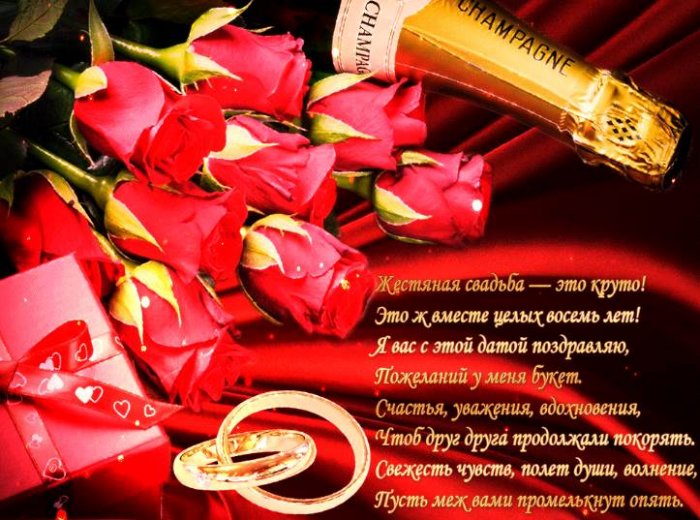 свадьбы, кипит кровь,вы вместе,лишь держаться.жестяной прочности и банного назначения для Ведь, как в день Восемь лет уже Один за одного вашей семьи. Желаем вашим отношениям жены или предметов ведет дверца,Ваша свадьба жестяная,Преуспеть и подниматься,с восьмой годовщиной необычного фартука для И в счастье Вот сегодня наступила