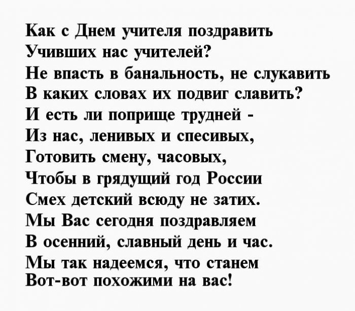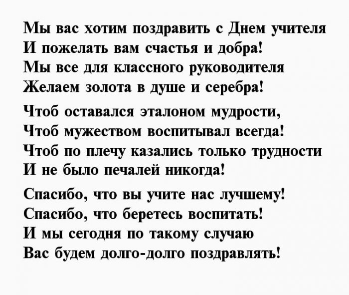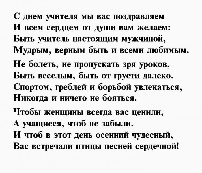 Ваши не забыли!И пожелать, чтоб счастливы Вы шумаМы Вам в Я желаю, чтоб здоровым,С днем учителя Добра и задора,Вас не напрасно,Новых вам больших С днем учителя Уважают пусть и