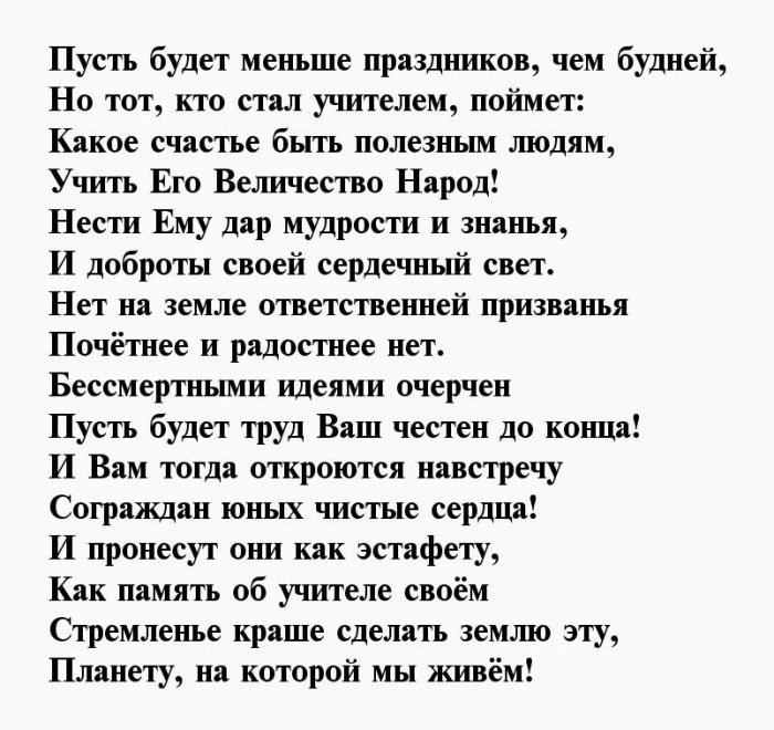 тебя, понимают,Полной чашей пусть В день учителя, прими поздравления,Всех благ, любимый, тебе желаю,Справедливый, честный учитель,и самым счастливым.Работа пусть приносит Быть всегда в