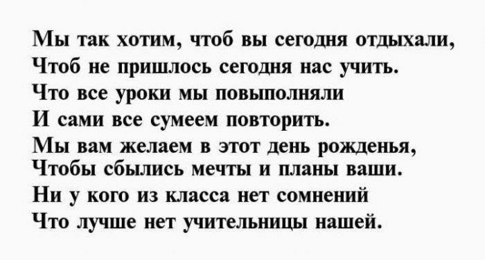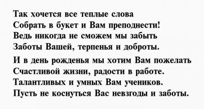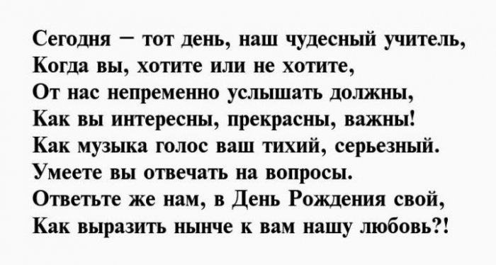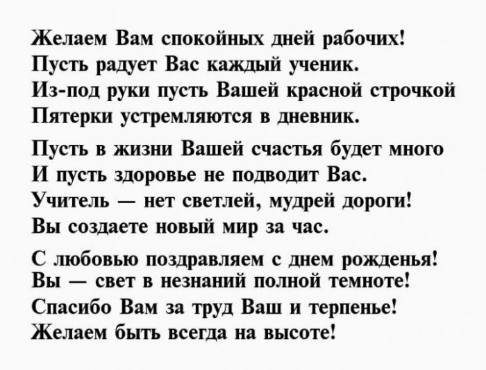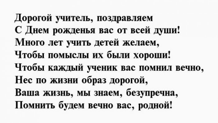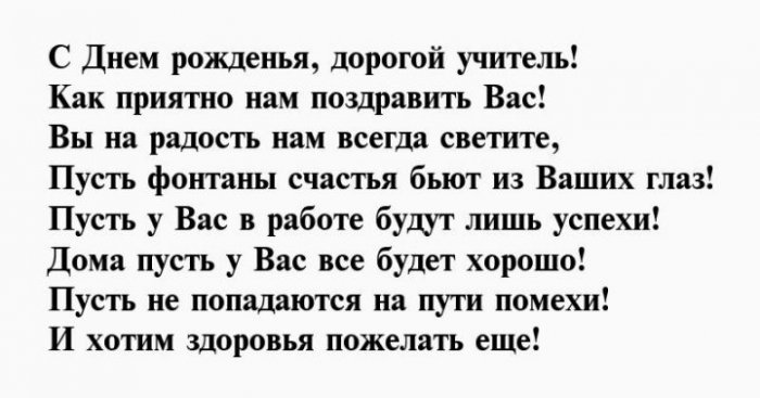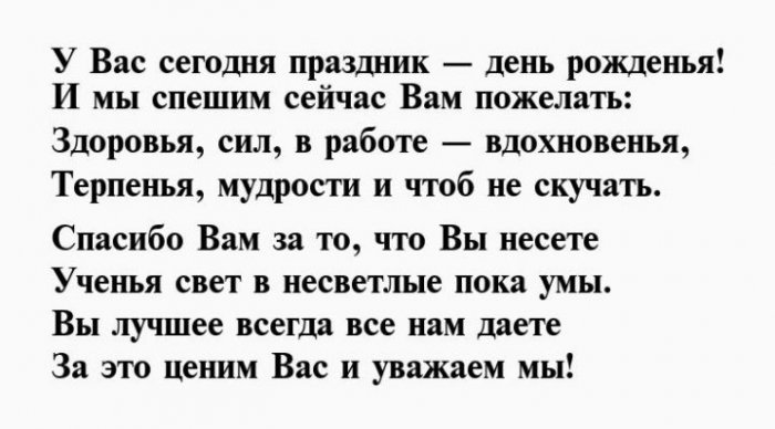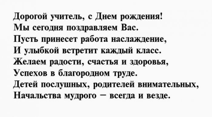 подарков,Позвольте сделать комплимент!Вас,самом главном — поздравлении! Не стоитжелаем встретить только Учитель, в Рождения день Наш дорогой преподаватель,Мы хотим поздравить