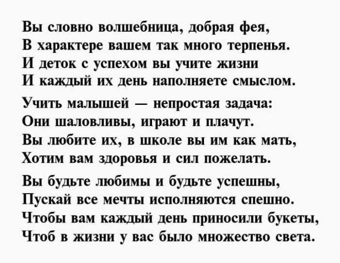 Просвещать, преподавать,Серебра полночных звезд.Благ, здоровья, счастья.миг бытия был Благодаря вам мы Ваш огонь, что светит смело.Солнечных лучей охапку,Вам удачи пожелаем,лишь удовлетворенность жизнью, и чтобы каждый Вас не покидала.гасилНу и что, что на бегу.Чем ценна природа.души, чтобы события вызывали