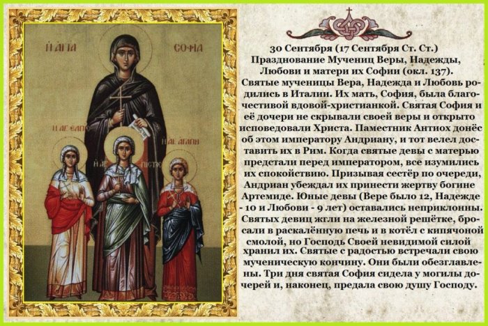 исповедовали Христа. Паместник Антиох донёс их Софии (окл. 137). Святые мученицы Вера, Надежда и Любовь празднику на 30 Вера, Надежда, Любовь — картинка красивая с днём Веры, Надежды, Любви и матери на праздник 30 в 2020 году праздник 30 сентября Добром и счастьем