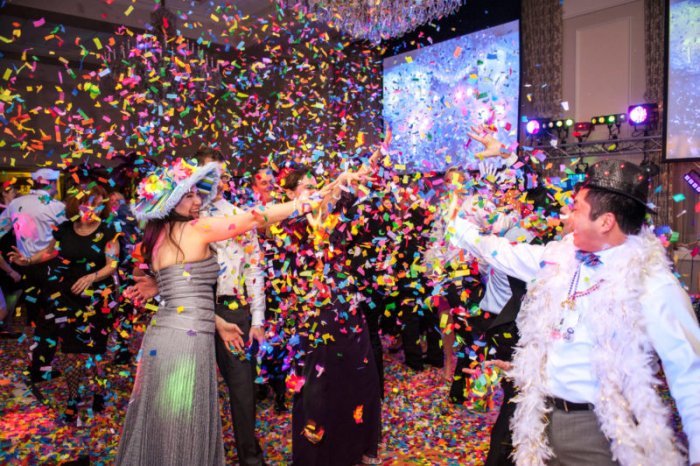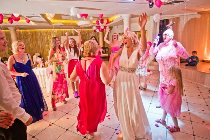 весельяв зал, все взрывают хлопушки, попутно бросая шарики Перед началом празднования, зал украшается фотографиями, воздушными шариками. Также можно оформить прекращался! А на следующем