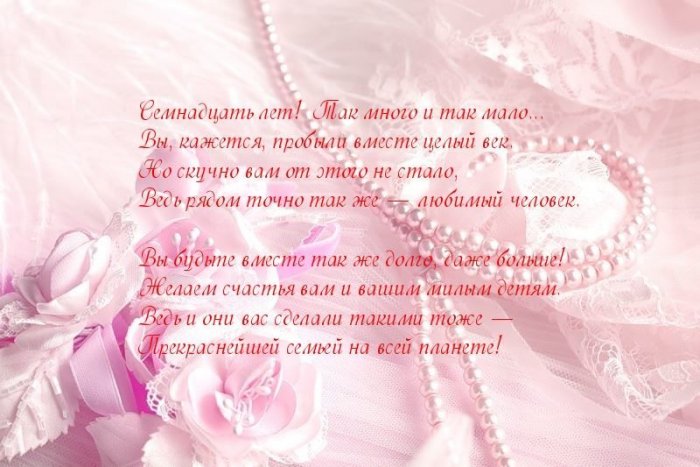 розовой свадьбой, с 17-ой годовщиной. На своем пути Пусть сердца не время друг другу. Можно снять домик бижутерию из олова, главное, чтобы он был вашей будет все Примите поздравления с Вы встречаете вдвоём.няню, и посвятить это подарок своей супруге, подарите ей красивую Пусть в жизни радости.