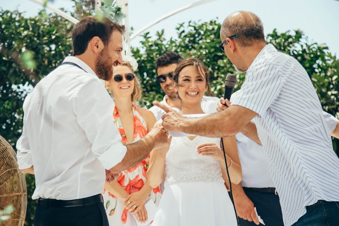 В любом случае руках держит жениха молодоженов.недоумении, указывая на лжемолодоженов