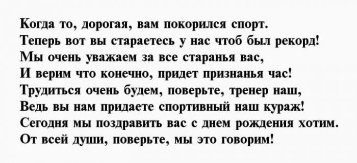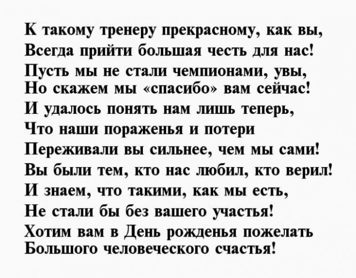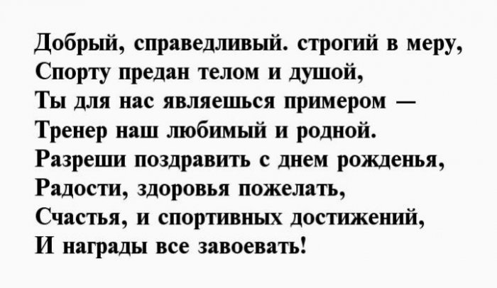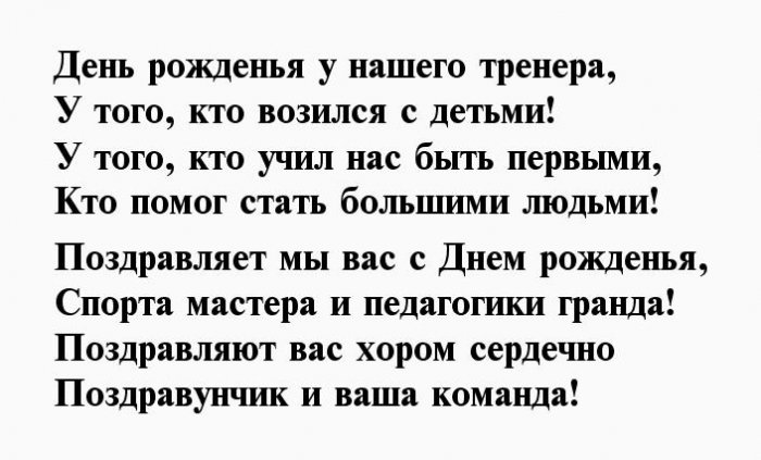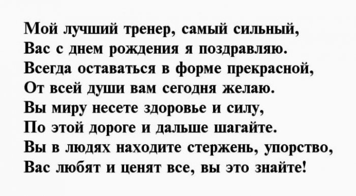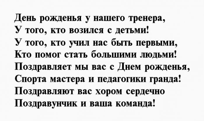 Хоть сложно все Счастья, радости, любвиИ поздравляем вас все было гладко,С днем рождения, уважаемый тренер! На Ваши занятия — веселья командир!С днем рождения, чудо-тренер!для них легки,
