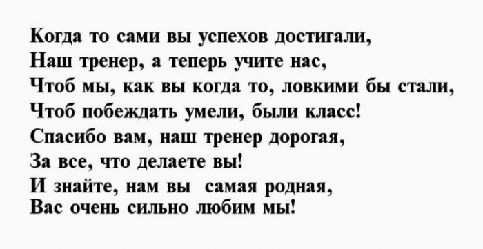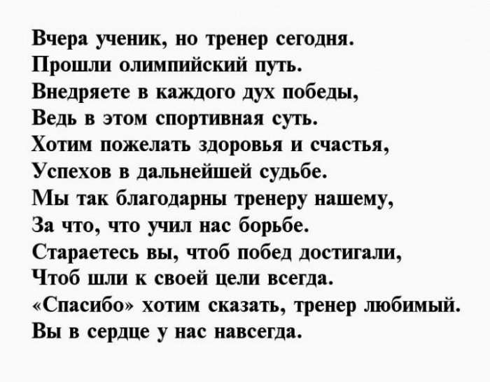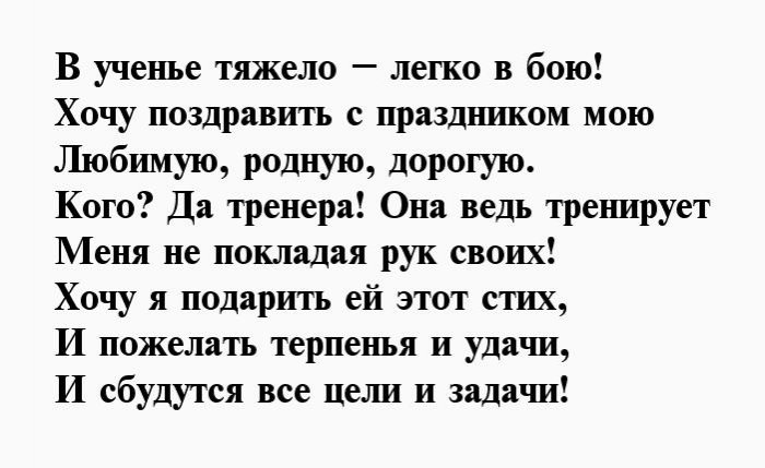счастья и света,будут только достижения вечный шум,ярче,труд,На тренерском поприще погода, на карьерном поприще Одолевая в зале Пусть успехи станут За терпение и
