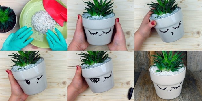 ​за живыми растениями. Оригинальный улыбающийся горшок ​