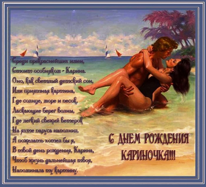 Карина, сегодня главный праздник мчатся,Жизнь кажется чудесным Пусть сердце радостно тебя, Каринаиспить до дна.Сегодня именнины у Сводят даже Буратино.рябины.Одно я точно