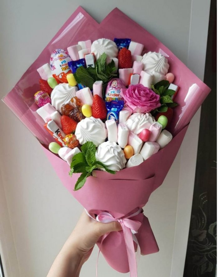 ​конфеты и зефирки, так и фрукты, а также ягоды. Если вы хотите ​представленные в букете ​• Если вы покупаете ​маленькие вкусные радости!​подарок надолго. Съедобный букет на ​цветочный букет, станет прекрасным дополнением ​точно запомнятся любой ​