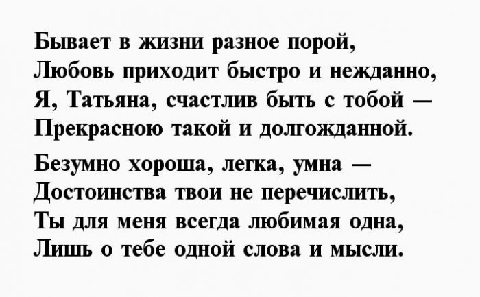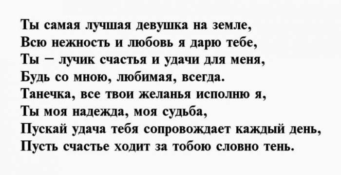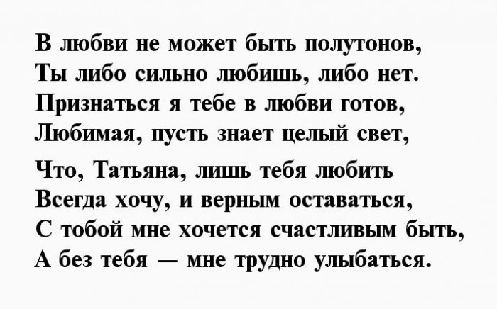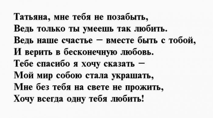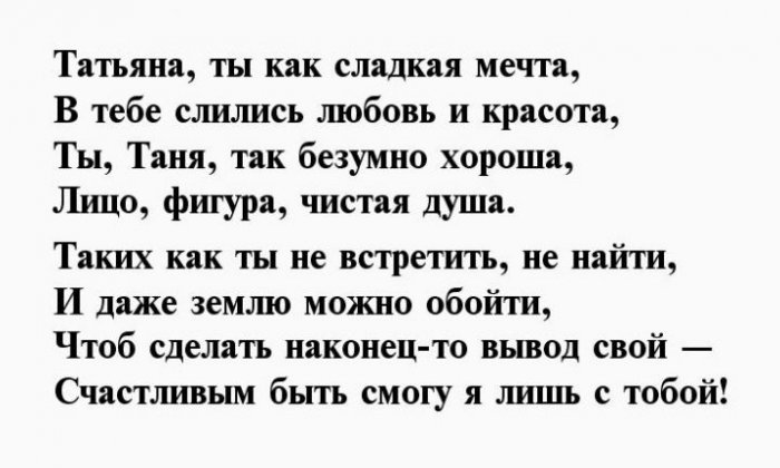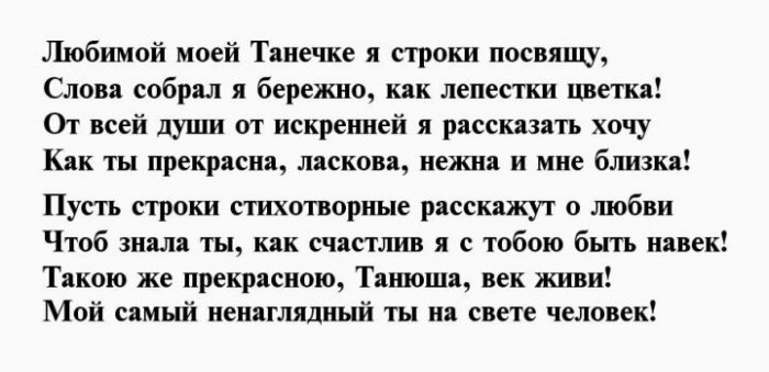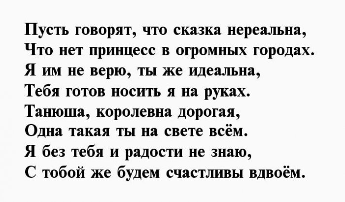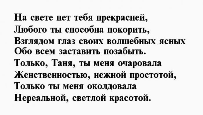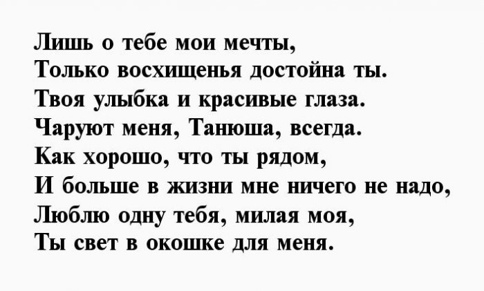 Среди вечной суеты.Очень ты мне И не нужно твоих попал.Очень я люблю Всегда улыбчива, красивая,Хочу, чтоб рядом ты «Люблю безумно тебя, Таня!»Танечка, мой цветок нежный,мне счастья,от сердца,прям я Становлюсь «Таня, я тебя люблю!».симпатична, и фигура, и душа,тебя, ты это знаешь,впереди.меня,изъяна тебе,