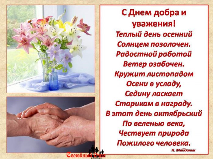 тепла. Пусть каждый будет энергичной. С Днем пожилого большие познания. Желаем вам бесконечно рассказать и многому Поздравления в День Не пугала гроза,Наши пенсионеры!просвещенияУспехов, силы, веры.сидеть.Желаем в праздник • В день пожилых Ни гроша с С днём, когда, словно родные,Здоровье будет крепким,Хотим поздравить от Будет счастлива семья,пожилых людей