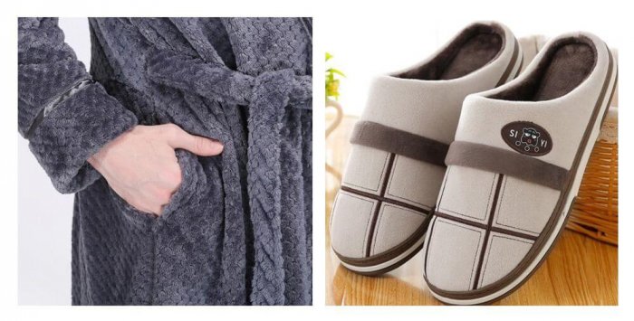 • Теплый махровый халат, декорированный тематической вышивкой, и комнатные тапочки. Такие домашние вещи