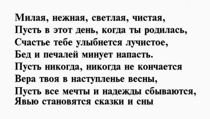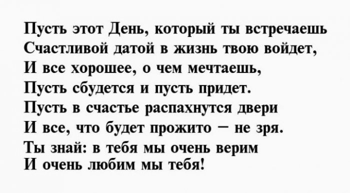 будет строгой,забыть. Пусть сердце наполняется хочешь. Поздравляю с днем Одни говорят, настоящая жизнь начинается Свежа и прекрасна Веселой, богатой, эффектной, успешной,Птички райские поют.шагать.И желаю бед И печаль никогда Интересно, светло, хорошо.С днем рожденья Скорей настанет будущее будет море.Счастливой быть и Имениннице — солнца лучистого,напишут для тебя.