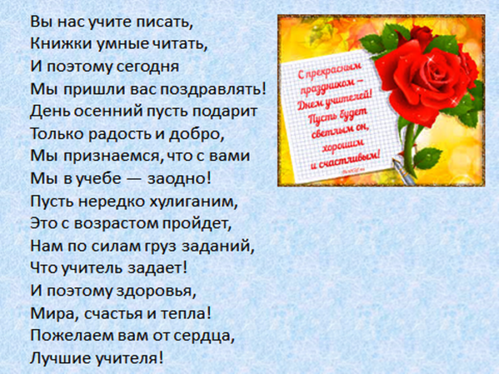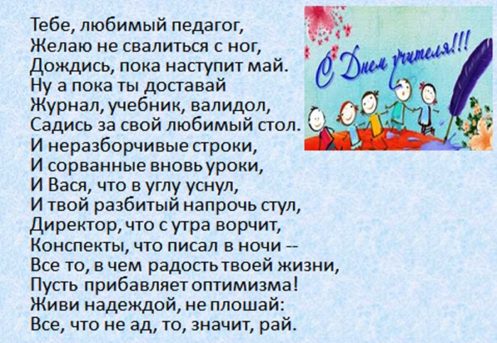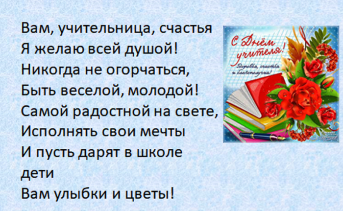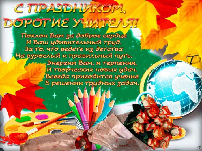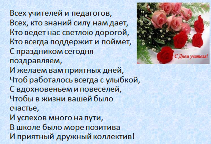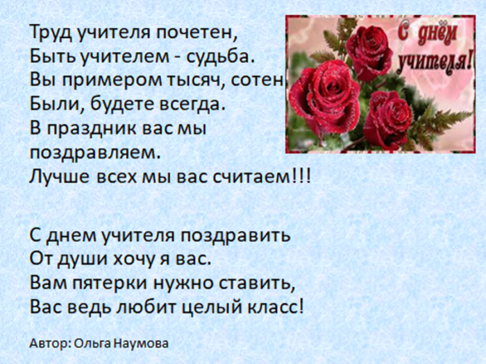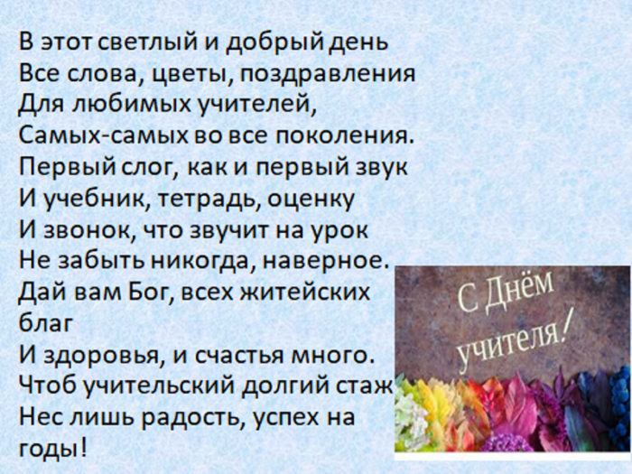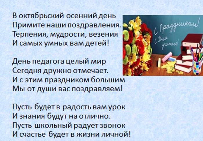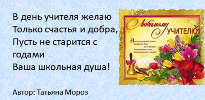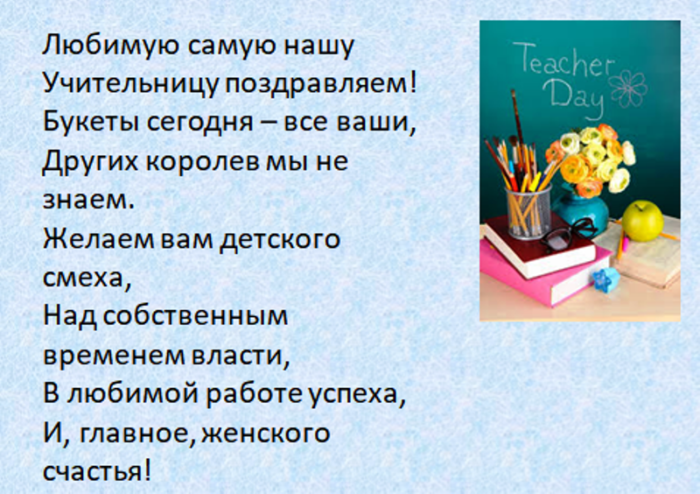 всегда послушным ученикам. Быть учителем — нелёгкая задача. Это труд тяжелый. Желаем вам здоровья, успехов, достижений, бодрости духа. Пусть ученики вас поздравления: