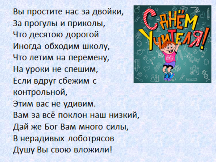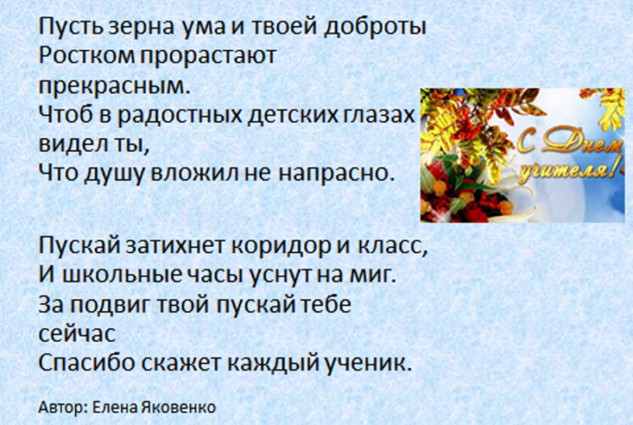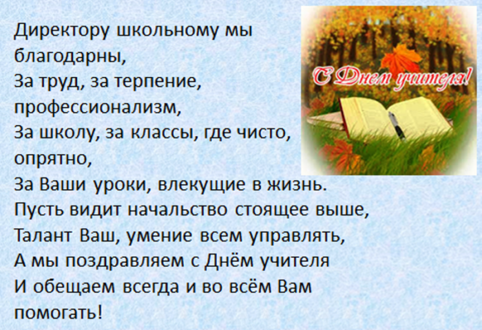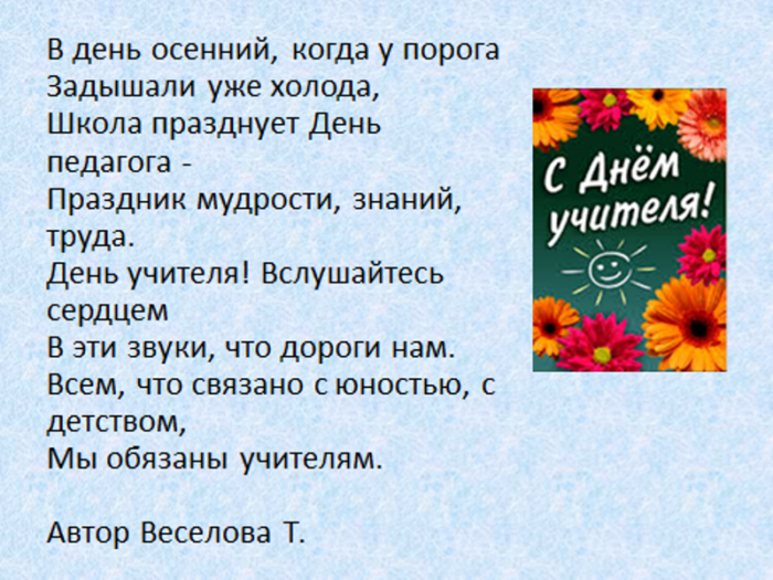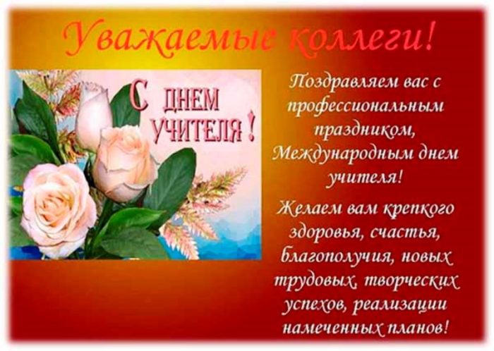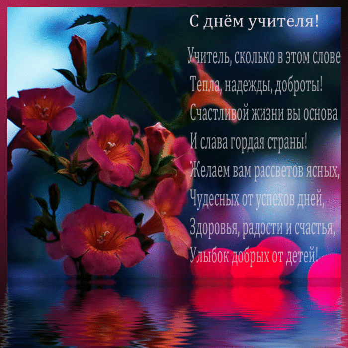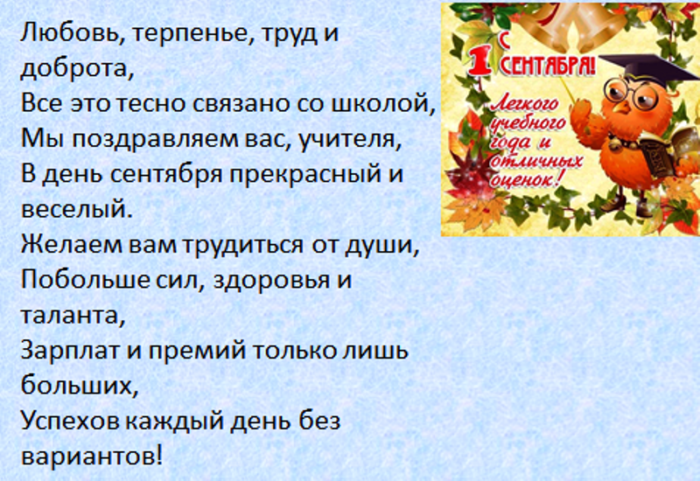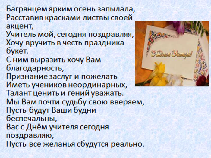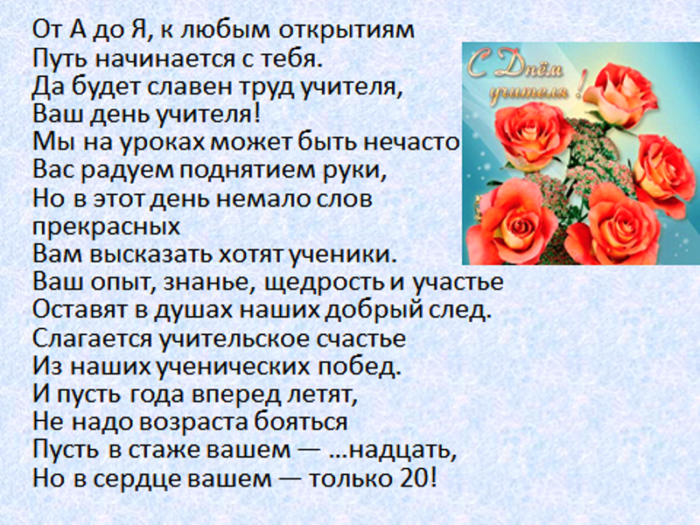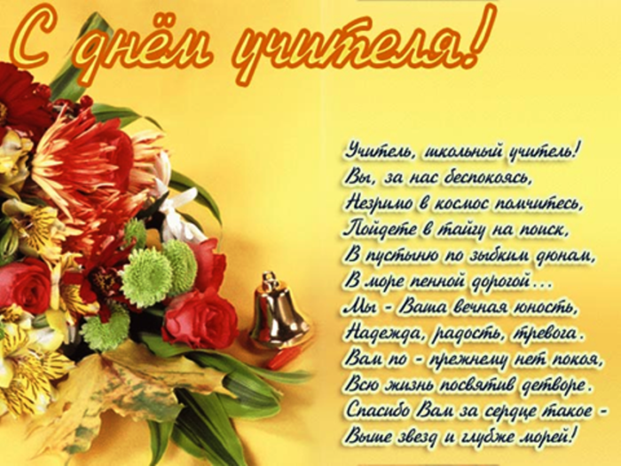 всегда послушным ученикам. Быть учителем — нелёгкая задача. Это труд тяжелый. Желаем вам здоровья, успехов, достижений, бодрости духа. Пусть ученики вас поздравления: