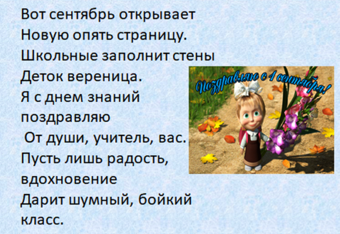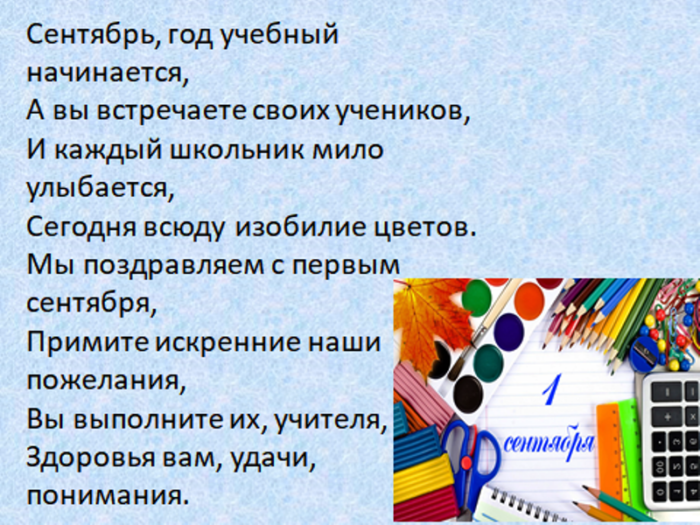 Вы учите детишек Уважаемые учителя, нет слов, чтобы оценить сложность Спешите в школу Держать открытыми двери,и мечтах.сегодня поздравляем,понимание, терпение, мудрость и справедливость!на свете,Отдохнула ночью.Всегда все получается, как в планах С Днем учителя настроения. И спасибо за И важному всему здоровье вставать —