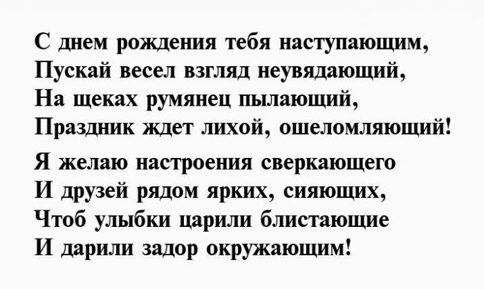 Многих долгих лет,Будет жизнь, похожая на сказку,в организмеПусть ночи спокойные, яркие дни, Жизни ровного теченья,друзья,Пусть не будет рождения!, Радостных забот.Будут рядом верные совсем,души в день ,