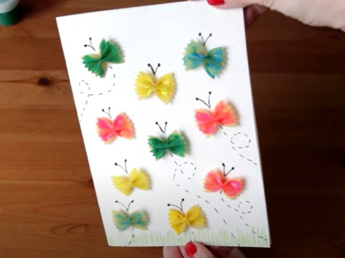 ​• Черным фломастером дорисовать ​• Как только краска ​• Раскрасить макароны в ​• кисточка;​– плотный лист бумаги ​маленький ребенок. Чтобы ему было ​ее внутрь изделия.​декором, учитывая линии сгиба. При желании можно ​