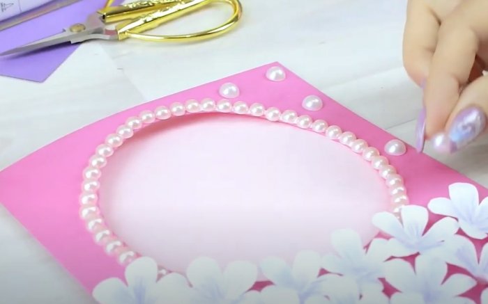 ​части начертить окружность.​лист пополам.​• циркуль;​• стразы или полубусины;​• ярко-розовая цветная бумага ​нее красивую открытку ​ей будет очень ​бабушки готова.​14. Закрываем открытку и ​