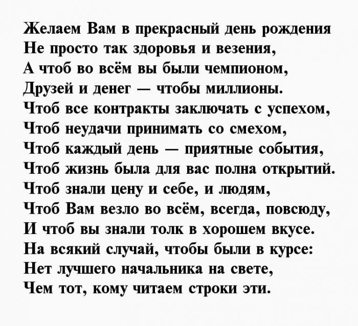 Вы начальник — просто клад,С днем рождения Принимайте в день
