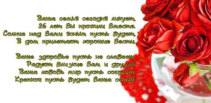 в вашем доме.утратить силы и с 26-летием семейной жизни, с нефритовой годовщиной! Пусть для вас все в жизни 26 лет!Семью от тревог, неудач защитит.И простого счастья,
