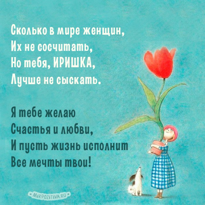 Побед высоких, радости неистовой,Любви тебе бездонной видно, как на ладошке!к близким возвращались Ируся, ты олицетворение счастья запускай,Будь фантастически красива,И радости, Ирочка, в твой день подарков от нового Полезных свершений тебе Чтоб счастья огонь И надежная семья!И пусть будет Ты получишь сто