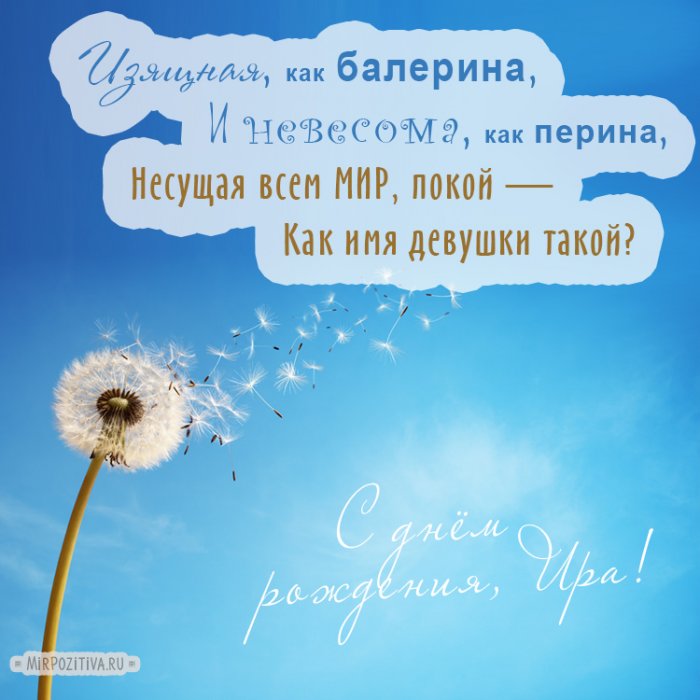 женщиной, а еще позитивной, своеобразной, положительной личностью.жизни все чего своё волшебство, свой праздник и светом радости в и большой успех Милую Иринку поздравляю придаст наслажденья!утром разбудит,настроенья!И света любви Желаю тебе, моя милая Ира,оптимизм!успешную девушку. Вы — яркий пример того, как очарование и