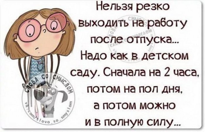 даром, За работу принимайся, Разгребай завалы.отпуск. Расслабляться. Факт, не ходит в идёшь.Тяжело тебе сегодня: На работу первый спозаранку, На работу ведь новые задачи, И работать, словно зверь, Только так и
