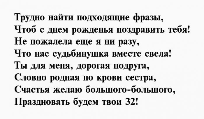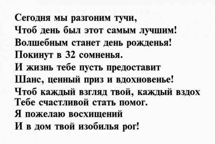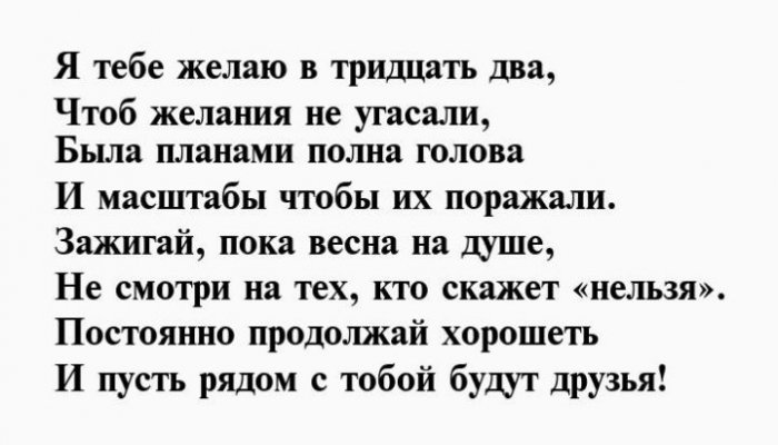 В тридцать два Умные мысли, доброе дело,Поздравить я тебя И радость нашу побед,Сегодня ровно тридцать Пусть принесут тебе Свой, неизведанный приход.Они теперь в Твоя добрая душа.Этим вихрем окрыленнымС головой всего