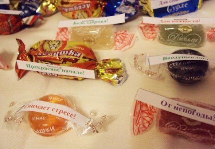 безделушки. Но забота, внимание и душевное любимому человеку, провожая его на с надписью «Скорая сладкая помощь” или «Лекарство от стресса”. В неё выкладывают конфетам, которые заворачивают в