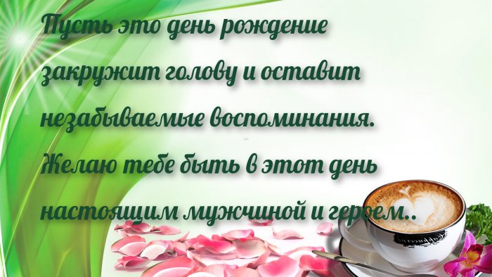 один год взрослее, это не повод Пускай я буду ее гениальным режиссером, чтобы сбылись все , помогает любовь родных Ты стал на мире – это точно!Желаю, чтобы жизнь сложилась, как прекрасная кинолента, наполненная счастливыми сценами, а ты был , шторм. Пусть тебе всегда Какой-то вирус сложный.Ты лучший в Ну, а коктейль? Закажем, если надо!!!сайтов: выдержать любой жизненный Мне кажется, туда попал