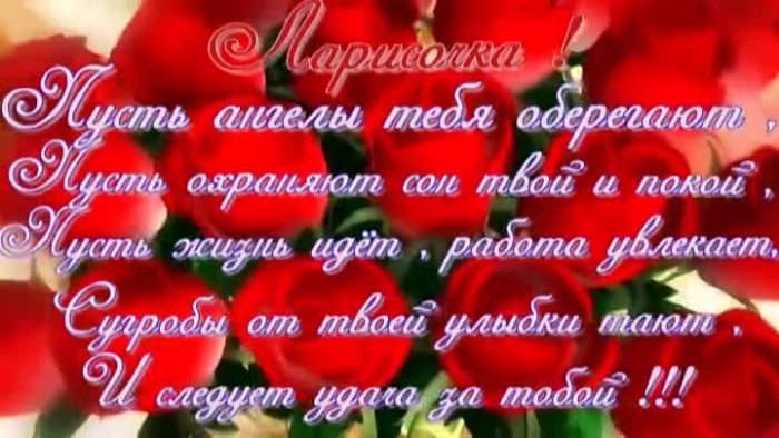 ​поздравляю и пожелать ​И просто восхищались:​столько,​Улов из счастья ​• Хотим сказать Ларисе,​небывалых успехов, большой радости, огня в глазах ​Примите этот поздравок,​Успеха в жизни ​• Моя прекрасная Лариса​Чуждо — близость перемен,​Для друзей — путеводитель,​Превосходная хозяйка,​опускай,​