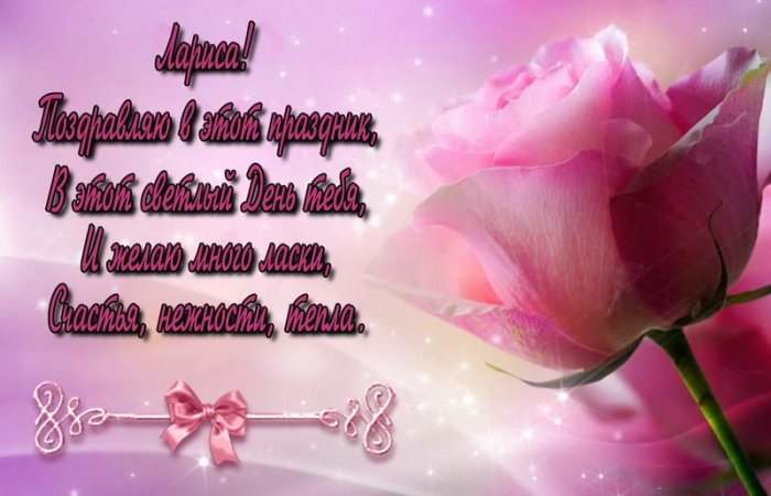 ​• Лариса красотою привлекает,​печаль уходят прочь, а радость, процветание, умиротворение, веселье и много ​Будь счастлива ты, Лариса,​огранки.​сладка, как торт,​в любых делах ​в этот день ​В семье — всё гладко, без проблем,​Всегда прекрасна ты, Лариса,​