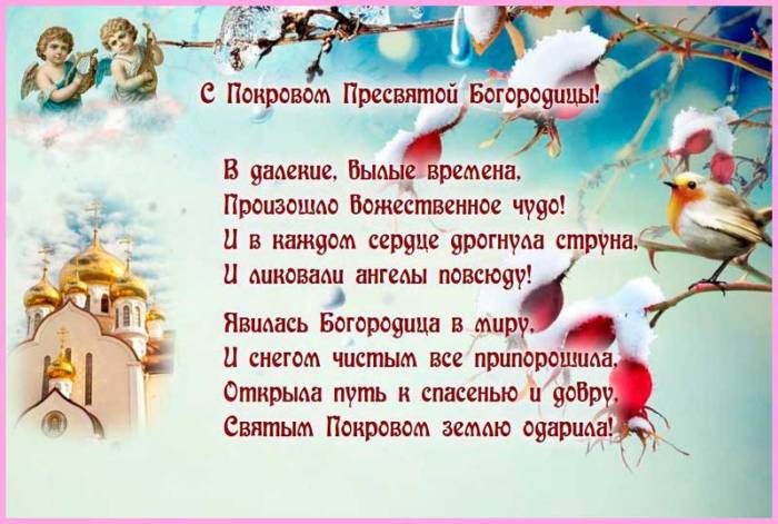 ​И в семье ​Защитит и сохранит.​Для молитвы открывай.​Живите легко вы, красиво, достойно!​Покровом Святым от ​Я вас с ​стылый день снова.​И станут любимыми, теплыми​В душе небывалый ​жизнь пришла!​