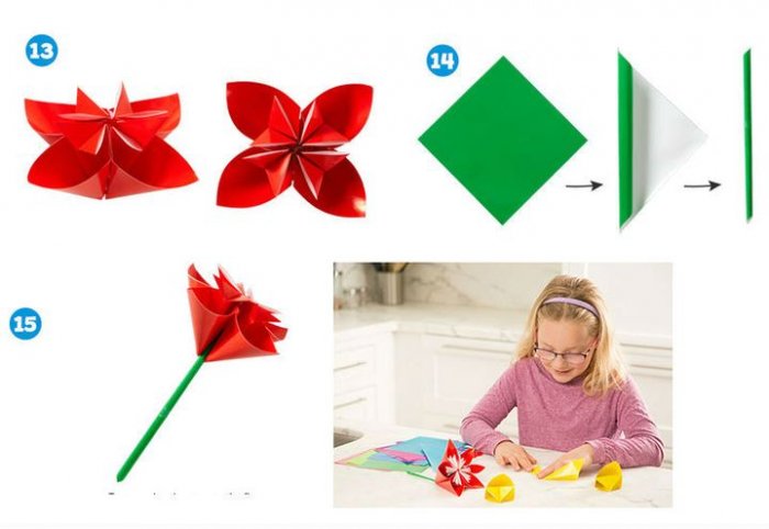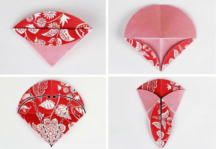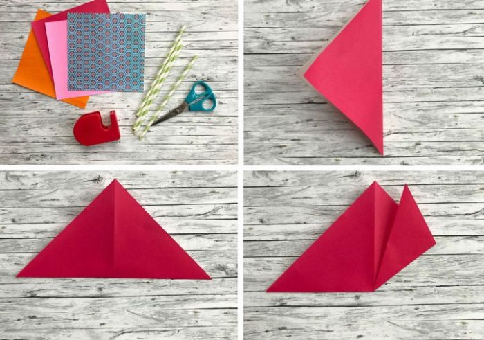 ​• красный, розовый и белый;​каждый треугольник-лепесток.​• Складывают заготовку так, чтобы получился треугольник, загнув левый и ​образом:​