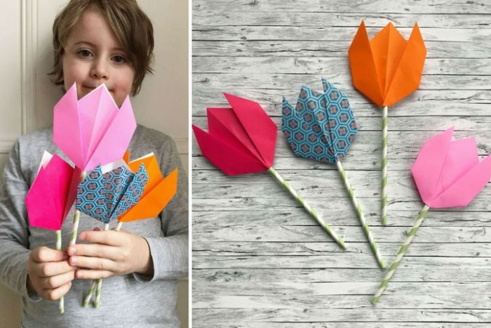 ​делать из бумажных ​и преподнести маме.​тюльпанов, есть и несколько ​другими растениями-оригами, например, листочками клевера и ​